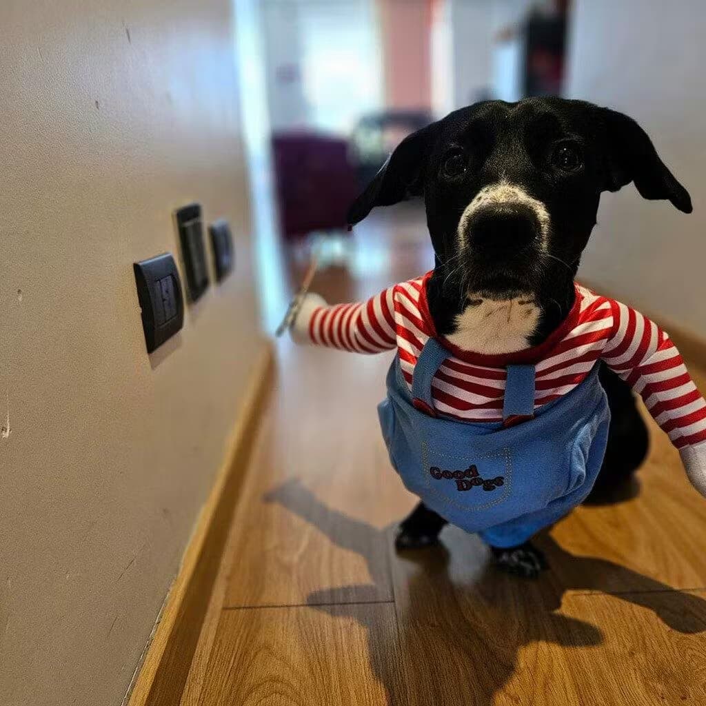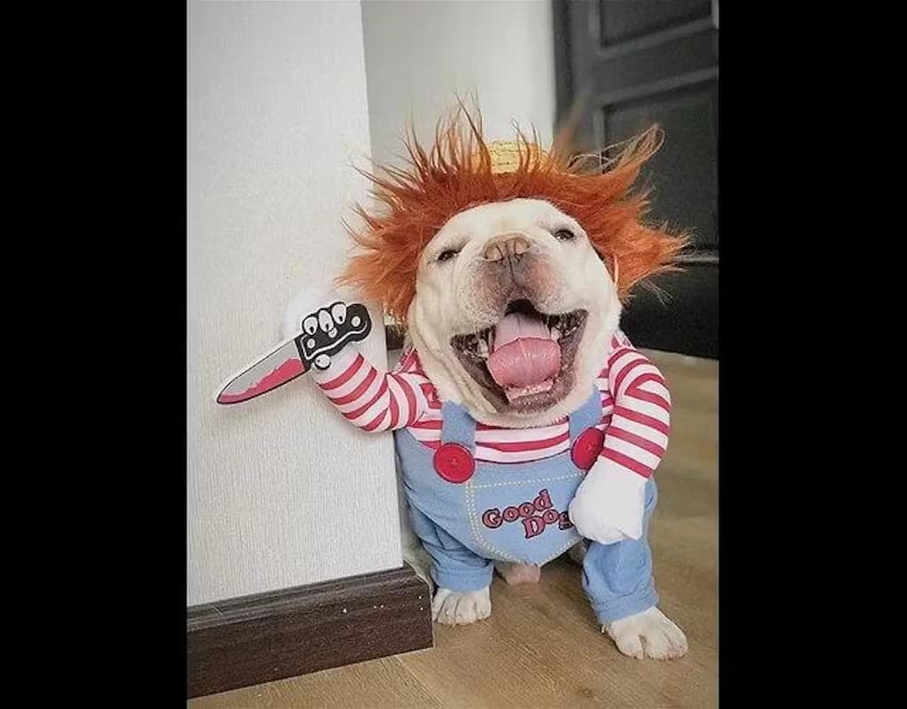 Olvídate de los disfraces aburridos. Con el Disfraz Chucky para Mascotas, tu peludo será el protagonista de cada fiesta, foto y video.
